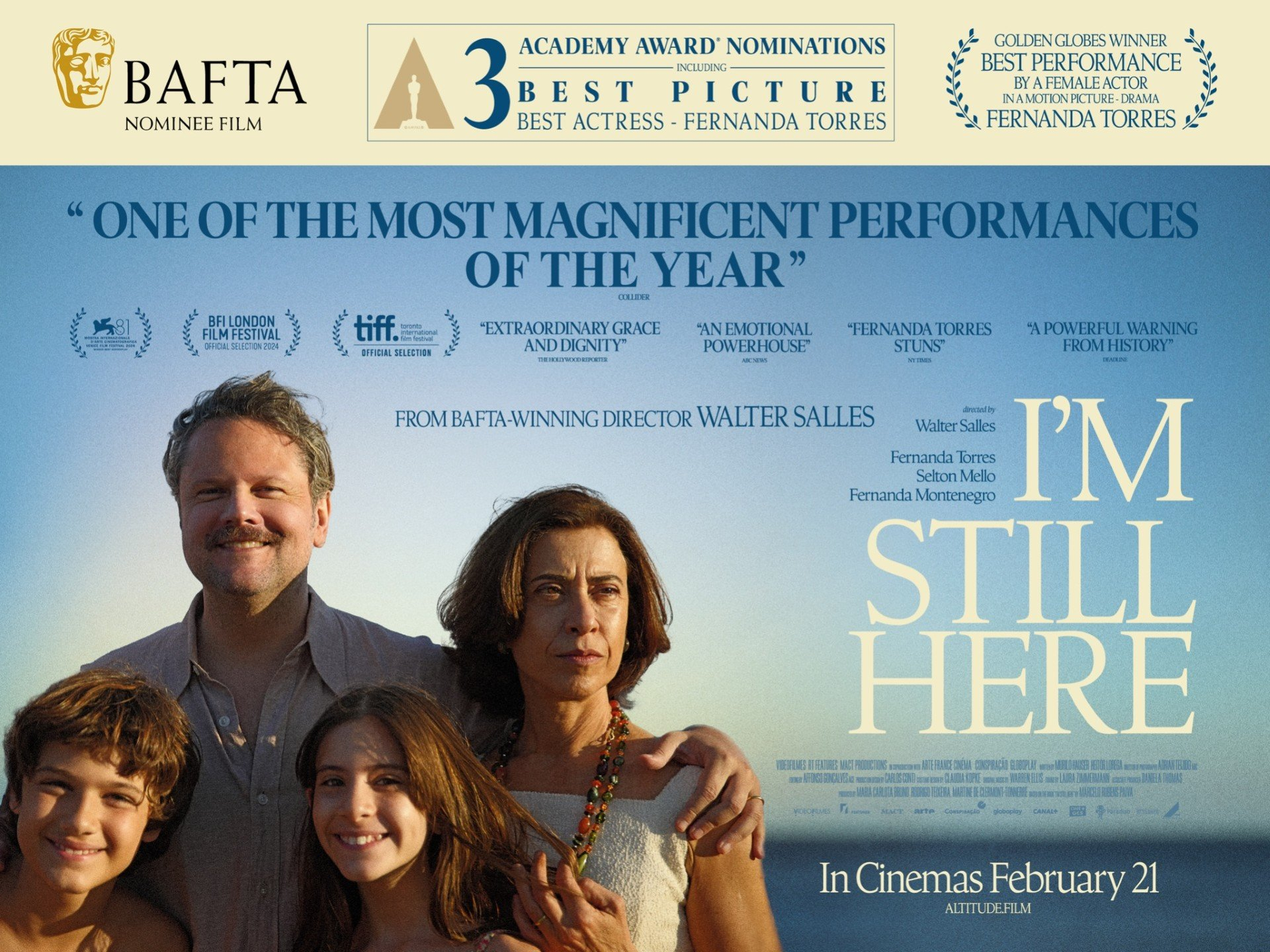 A cerimônia do Oscar será em 2 de março, em Los Angeles, com apresentação do comediante Conan O'Brien. Além disso, Ainda Estou Aqui também concorre ao britânico BAFTA, em 16 de fevereiro, aumentando ainda mais a visibilidade do filme no cenário internacional.