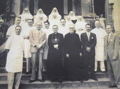 Foto: tirada em frente a Santa Casa de Misericórdia, em 1950. Na foto encontramos da esquerda para a direita, começando de baixo para cima: Dr. José Maria Coura, Ricardo Lunardelli, Bispo Dom Lafayette Libânio, Padre Albino, José Olímpio Gonçalves e Dr. Renato Bueno Netto; Doutores José Rocha, Joaquim Fagundes, Antonio Barba, Alberto Cunha e Silva e Vicente Bucchianeri Irmãs Mercês, Ildefonsa, Reginalda, Maurícia e Rosa Maria; Irmãs Laura, Bárbara, Francisca e Clemência