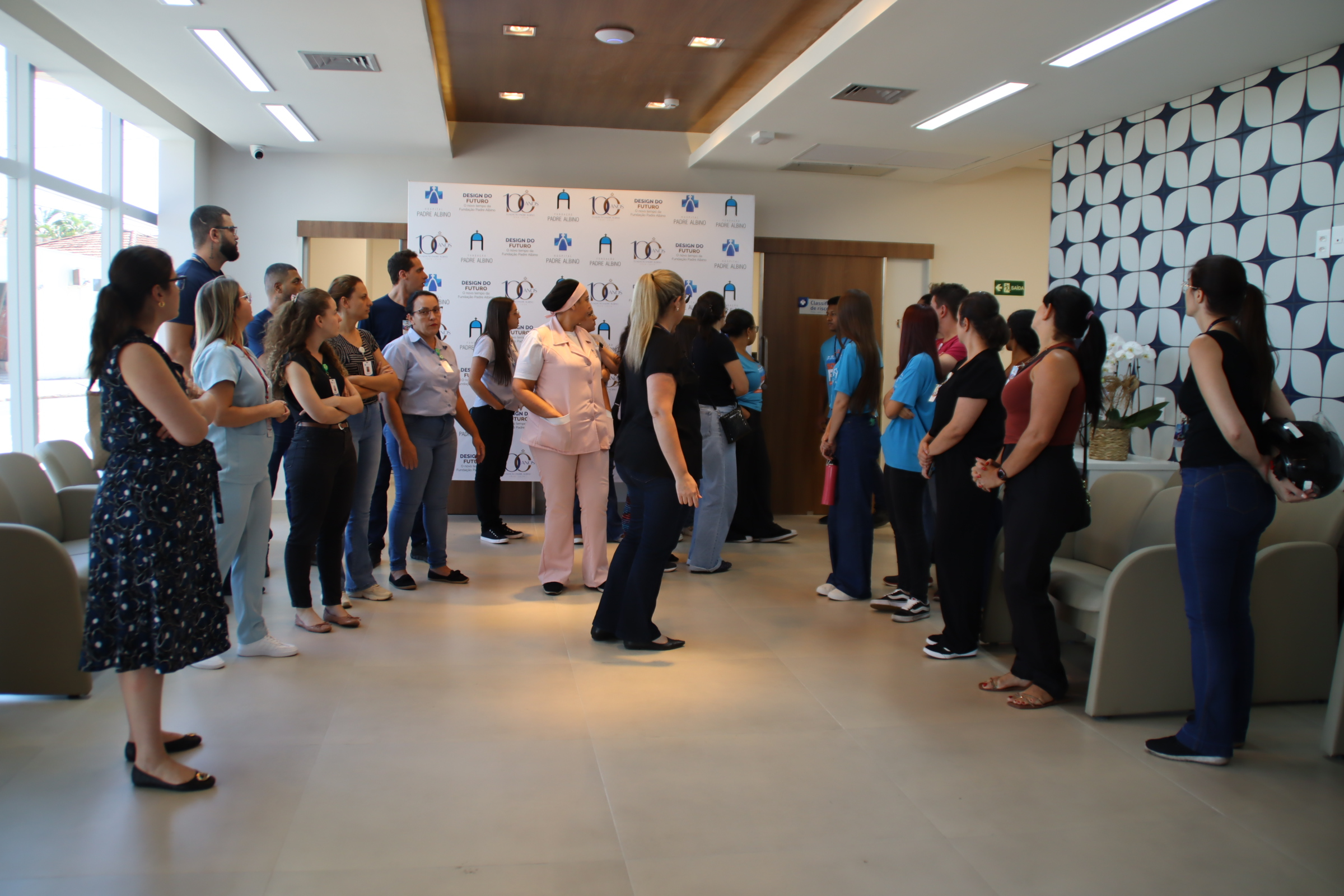 Colaboradores da Fundação Padre Albino participaram de tour pela nova unidade do Hospital Padre Albino. O objetivo foi apresentar a estrutura e permitir que as equipes conhecessem os espaços e serviços oferecidos. Durante o percurso, eles visitaram os diferentes ambientes do prédio e receberam informações sobre a integração com os serviços existentes no hospital.