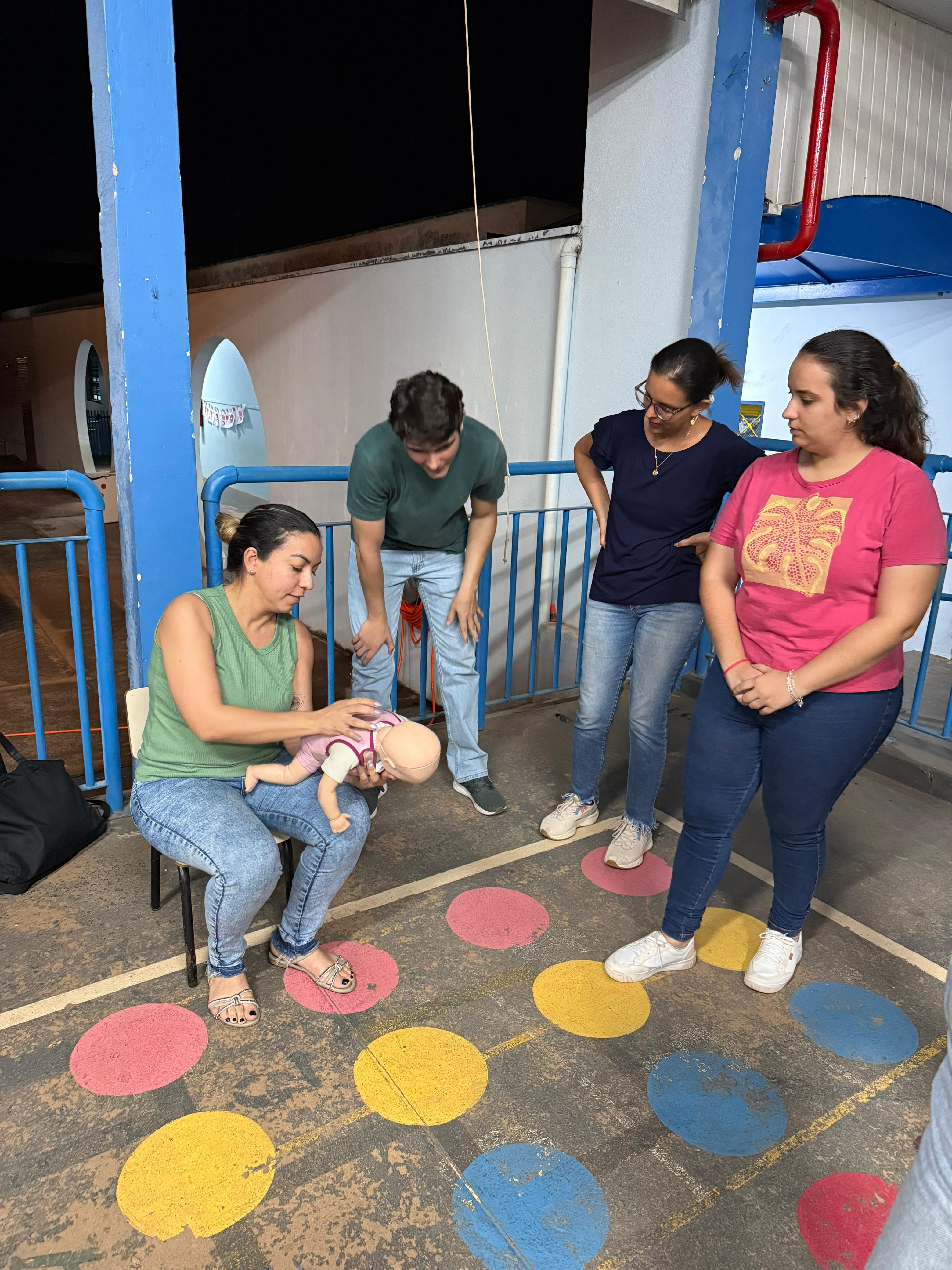 Divididos em grupos, os estudantes de Medicina conduziram oficinas práticas com os educadores, que aprenderam a realizar manobras de desengasgue (Heimlich) em bebês, crianças e adultos, e até massagem cardíaca.