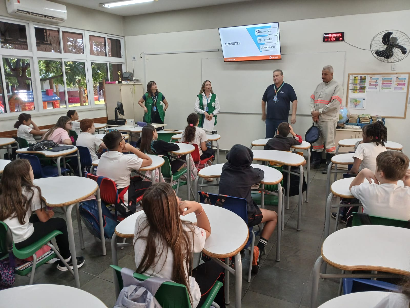 Na aula, os alunos descobriram que no ambiente doméstico são muitos os riscos envolvendo eletricidade. Entre os principais riscos estão o manuseio irregular de eletroeletrônicos e eletrodomésticos; uso indevido de extensões e conexões como os famosos “Ts” ou benjamins; e acidentes com carregadores de celulares.