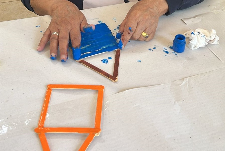 As pessoas idosas do Recanto Monsenhor Albino participaram de oficina de artesanato como parte das ações terapêuticas integrativas da instituição. A atividade foi realizada no dia 12 de setembro e consistiu na construção de pequenas casinhas com palitos de sorvete, que depois foram pintadas com tinta guache.